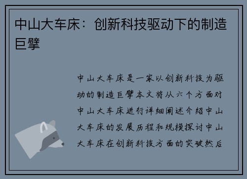 中山大车床:创新科技驱动下的制造巨擘